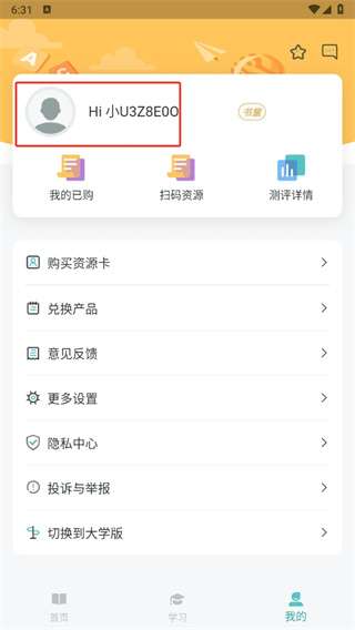 2、然后在我的页面中有我的已购、扫码资源、测评详情等服务,我们需要点击左上角自己的【头像】。