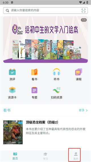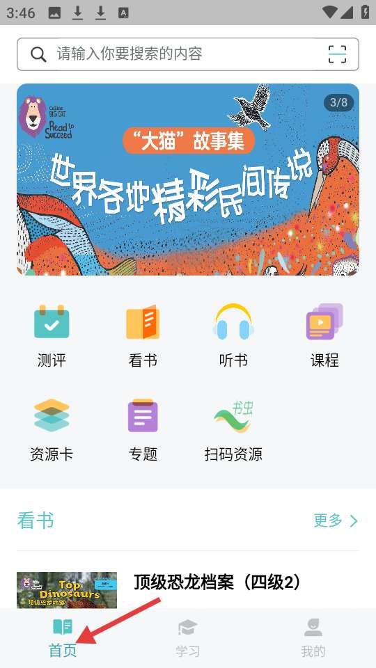 1、首页有搜索栏轮播图展示大猫故事集,下方设测评看书等功能入口,可快速进入学习板块。