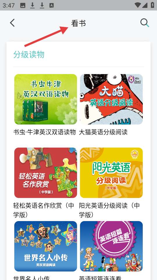 3、看书界面呈现分级读物包含书虫牛津、大猫英语等英汉双语读物,还有轻松英语名作欣赏等多种选择。