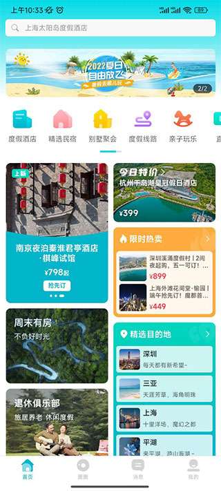 1、下载并进入周末酒店应用程序。在主页上,您可以看到度假酒店、精选民宿、别墅聚会等部分。您还可以通过搜索来查找酒店。