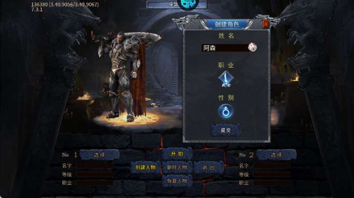 1、打开游戏登录选择区服后点击启动,选择职业性别,并取一个名字,点击提交。