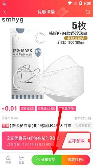 6、在商品的详情页面之中可了解其具体的信息,在下方能够看到一个绿色的分享有奖按钮,点击操作即可。