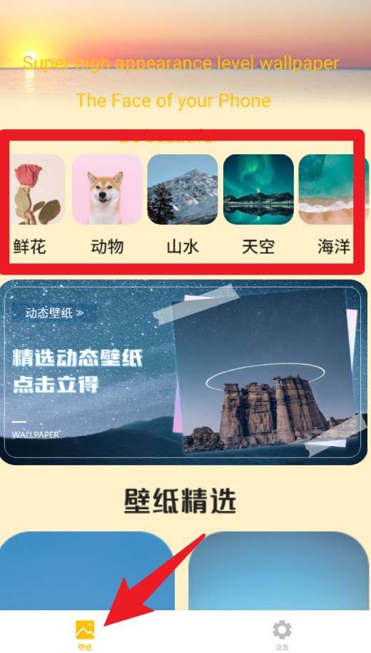 1、在壁纸首页顶部分类栏中,提供鲜花、动物、山水、天空、海洋等主题,帮助用户快速找到喜欢的壁纸类型。