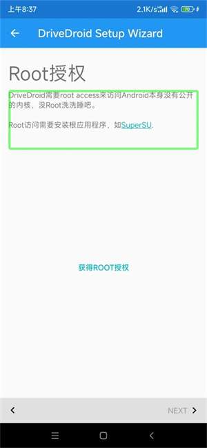 2、进入获取root授权页面,点击“获得root授权”按钮。鉴于个人root方式存在差异,需选择适配自身的方式来授予root权限。成功取得root授权后,接着点击next按钮。
