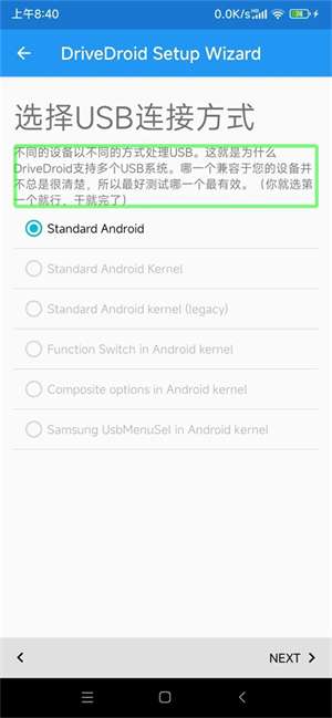 5、接下来需选择USB连接方式,选中“Stand ard Android”选项,接着点击NEXT继续。