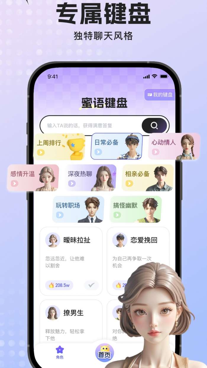 蜜语输入法是一款受欢迎的聊天输入法软件,拥有丰富多样的恋爱聊天话术可以实时更新,轻松自由选择感兴趣的聊天话术来学习,自由享受有趣的聊天互动,还提供智能搜索方式,可以输入汉字来搜索查找相关的聊天话术,随时帮助用户打破聊天尴尬瞬间,能完全满足用户的所有使用需求,还提供专属输入法模式,轻松让用户快速打字输入,随时随地提高输入效率,给用户带来全面的服务和体验,有需求的用户欢迎来本站下载软件。