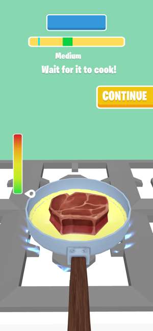 2、只要到达绿色的位置就可以用锅铲给牛排翻一个面,之后的就是开始等待最上方的烹饪时间进度的移动;