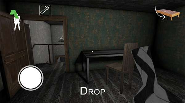 3、打开大门进入房间,要是看到老奶奶,可以点击右上角的桌子图标,就能躲在桌子下面了。