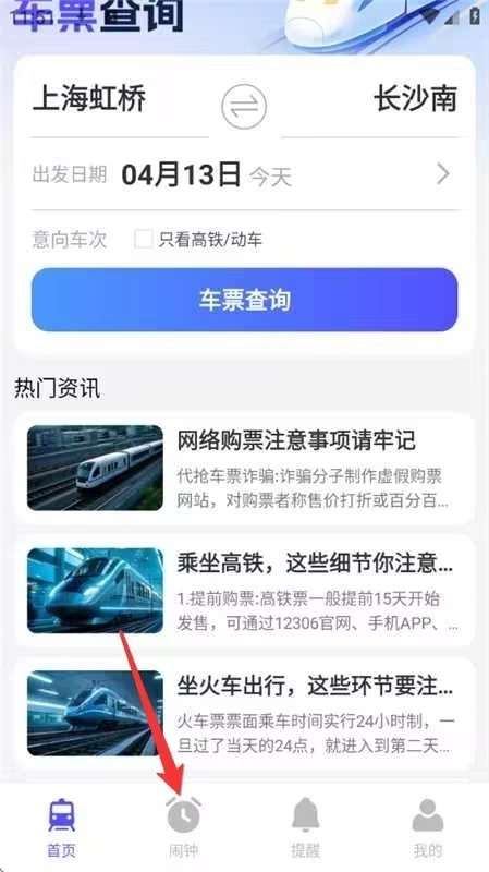 铁路高铁票查询助手如何添加并设置新的闹钟提醒?