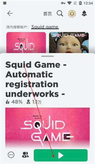 6、Squid game进入方式:在首页右上角点击搜索,输入"Squid game",下拉找到点赞48%,人数1.1w人的那个房间进入即可。