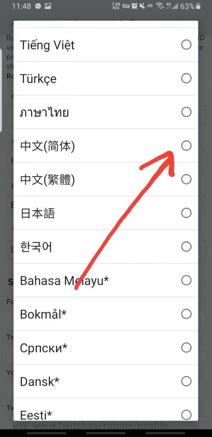 4、进去用户信息界面向下翻页找到language(语言)然后右边有一个向下的箭头点击。
