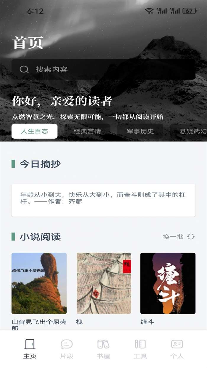 1、在本站内下载安装,打开软件,在首页通过搜索栏输入书名、作者等关键词查找书籍;也可浏览推荐图文寻找感兴趣书籍;还能导入本地书籍到“我的书屋”。