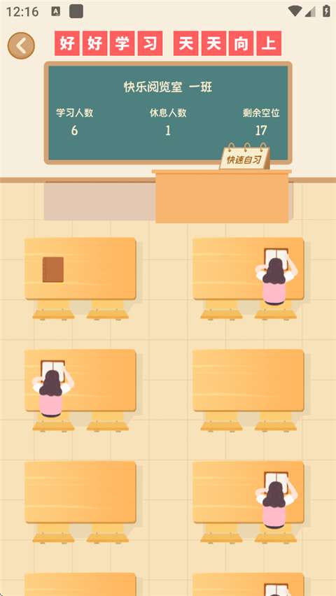 自律自习室app是一款致力于提高学习和工作效率的时间管理应用,提供三种自学模式:定时模式、校园模式和冥想模式。它帮助用户高效规划时间,摆脱“低头族”状态,最终达到自我提升的目的。我们可以为用户提供各种场景的自习室,如教学楼、图书馆、工作区、私人自习室等。你可以选择一个自习室,进入并找到你的座位,然后开始你的自习。该软件将为您提供最理想的自学环境。