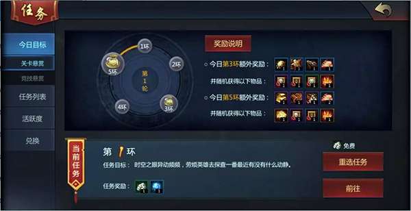 首先进入视线的是今日目标,今日目标涵盖关卡悬赏与竞技悬赏,它们皆属于每日任务。于关卡悬赏里,存在特殊的跑环任务,不仅可领取每一环的奖励,完成第3环和第5环时,还能收获额外奖励。温馨提示:神兵值越高,所能获取的奖励就越丰厚!在竞技悬赏中,同样有一些简单的日常小目标,例如第一个任务奖励,只要完成一把竞技匹配并取得胜利,就能直接拿到。各位大佬们,是不是感觉这轻而易举呀?