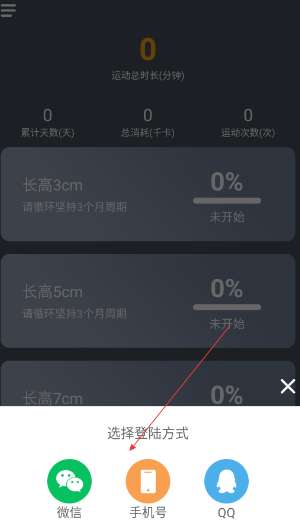 3、在运动数据页面的主界面上,选择微信、电话号码或QQ等任何登录方式,使用运动记录和身高规划等功能。