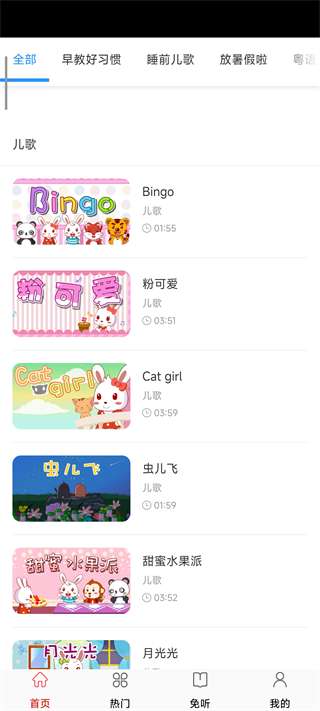 1、打开快听免费音乐大全App,在首页可以收听各种各样的儿歌视频。
