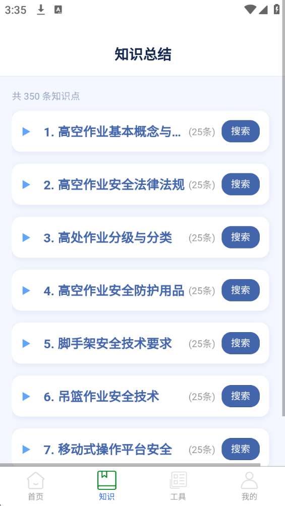 系统化知识库:按章节梳理 350 + 核心知识点,涵盖高空作业基本概念、安全法律法规、作业分级分类、安全防护用品等全模块内容,条理清晰,方便快速查阅、背诵记忆。