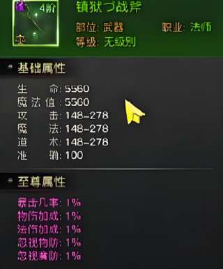 3、其次如果大家玩的是法师这个职业的话,推荐的武器大家要选择一些比较容易上手的武器,因为法师在整体的操作强度上面比较强,这里推荐的武器叫做镇狱战斧,这个武器也是比较容易上手的一个武器,而且武器本身的,魔法数值以及生命数值都是非常高的,所以使用这个武器的话,大家不用担心自己的血量出现问题,后期这个武器在升级了之后,还有一定的暴几率可以进行提升,提升的数值也可以达到4%的数值,在新手阶段的话使用这个武器带来的暴击力提升其实绝对是够用了,如果此时大家去刷图的时候遇到的群怪比较多的话,也可以利用这个技能武器效果打出更多的暴击。