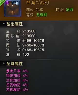 4、另外推荐的一个武器叫做断海战刃,这个武器也是比较适合法师用的,不过更适合一些高阶玩家使用,因为它的品质也是达到金色的,这类品质的武器在初始属性上面就会比很多的武器数值要高,而且在完成进阶之后,其实这个武器带来的极品数值,也会比前面的战斧高很多,不过培养起来的话,是目前比较需要资源的一个武器,对于法师,还有另外一个比较推荐的金色武器,也就是星辰战刃。