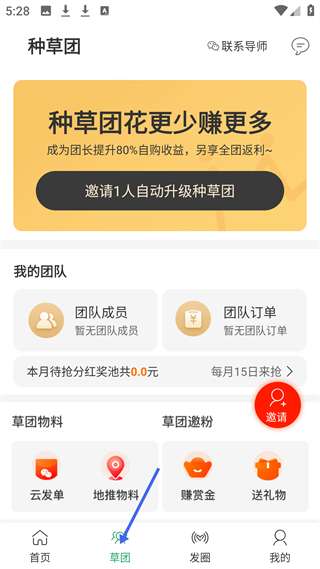 2、草团板块可升级种草团,成为团长提升自购收益,管理团队、使用云发单物料,邀人升级享全团返利。