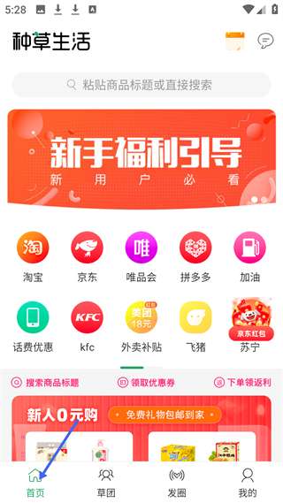 1、首页有淘宝、京东等平台入口,新手福利引导清晰,新人0元购可领包邮礼物,还能搜索商品领券、下单拿返利。