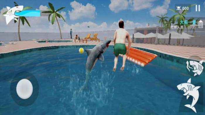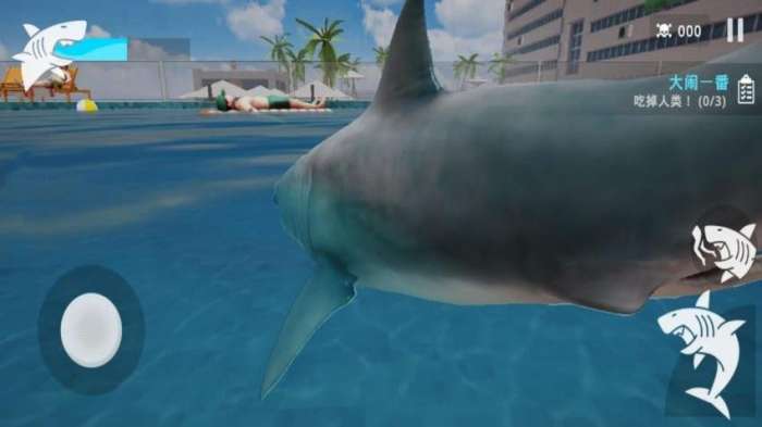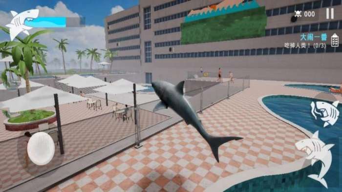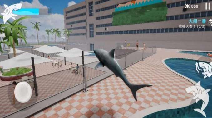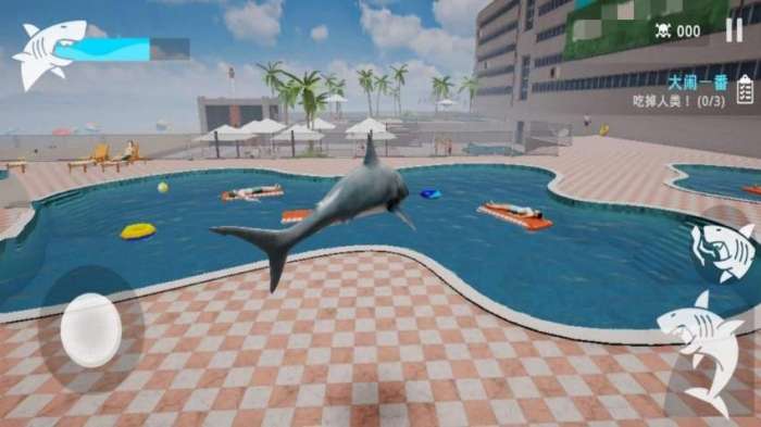 1、玩家进入游戏后,控制鲨鱼跳跃到游泳池里面,你可将鲨鱼的踪迹隐藏起来,不能让其他猎物发现相应情况。