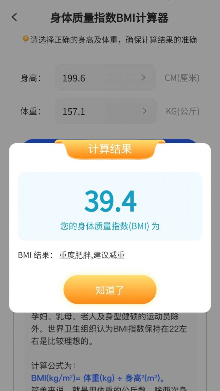 2、可以进行身体质量BMI的计算,输入数据,可以快速计算结果。