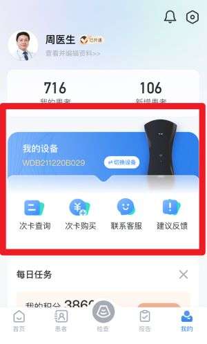 2、在“我的”页面可查看绑定设备与患者数据,支持次卡购买、客服咨询及意见反馈功能。