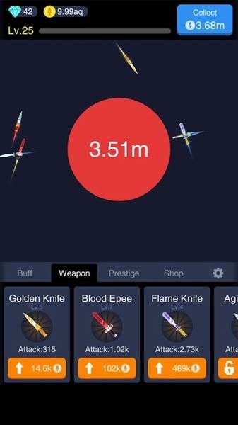 放置之刃这是一款射击类游戏,首先在界面中会出现一个靶子,通过点击的方式,快速的把你的射箭工具插在圆圈上,数量越多越好,而且保持密集,不会掉落。这是单人的练习模式,后续会开一个房间进行挑战,里面会有多个玩家在里面PK不断的去设计那些上面有数字显示的圆圈,这样就能够获得金币。就可以去解锁升级更多好看的厉害的射击武器了。