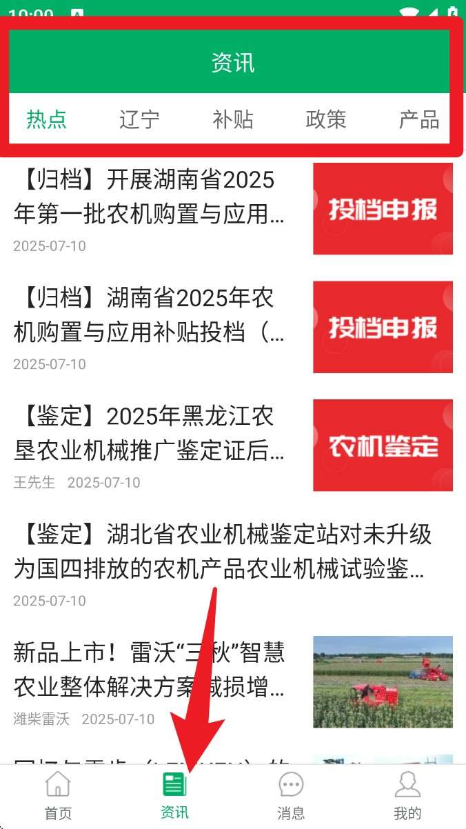 4、点击底部“资讯”栏目可查看政策、补贴、产品等分类讯息,支援按地区和内容标签筛选阅读。