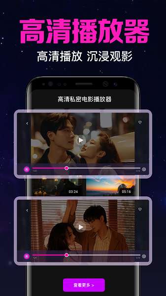 高清电影私密播放器是一款注重隐私与画质的专业级视频播放应用,在这里,提供了安全可靠的私密文件管理工具,支持用户在线设置专属的密码或者一键设置应用隐藏图标,致力于为用户轻松打造专属的私密空间,安全守护私密文件的隐私,让访问各类私密文件不再担心隐私泄露,从而安全保护信息。软件中还具备了强大的视频播放器,通过在线导入手机本地视频,帮助用户轻松播放视频进行观看,以便用户享受全新的沉浸式观影体验。
