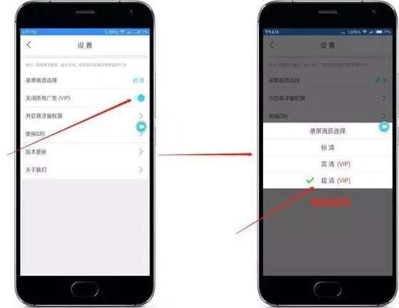2、进入软件的“设置”界面,您可以看到我已经为会员功能启用了“关闭所有广告”功能,在这里我点击了“屏幕录制质量选择”;在这里我们可以看到,“高清模式”和“超高清”模式都需要VIP激活,但我们可以自由使用。