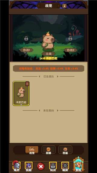 1、获取的宠物可以参与战斗,释放技能,为战局带来更多优势,宠物上阵位分为【主战】和【协战】,宠物天赋仅对主角生效,上阵宠物的战斗属性从主角属性继承而来。