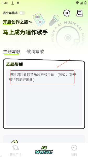 2、录制成功后,进入软件首页,用户们可以在“主题写歌”板块输入自己想创作音乐的风格和主题。