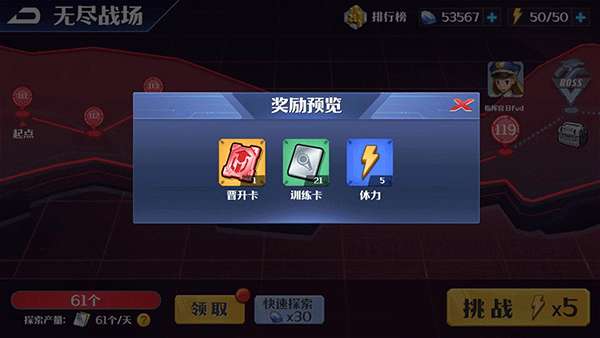3、每日固定产出一定数量驾驶员训练卡,通关层数越高,每日奖励数量越高。首次通关boss关卡可领取通关奖励。包括驾驶员晋升卡、驾驶员训练卡以及体力值等丰厚奖励。