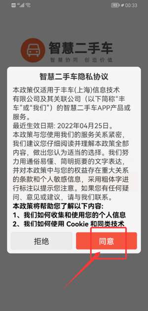 1、启动智慧二手车应用程序,然后在隐私协议弹出窗口中单击“同意”以继续下一步。