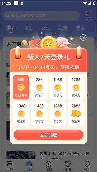 1、新用户进入拾贝小说app后可签到领取平台金币。