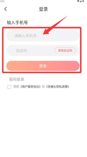 1、登录界面输入手机号及验证码,点击登录完成账号验证。