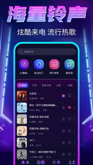 1、铃声搜索: 应用提供强大的搜索功能,用户可以根据关键词快速找到热门的DJ舞曲等,满足不同用户的DJ资源喜好。