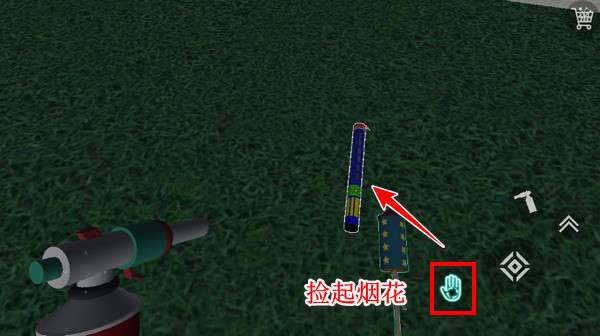 4、进入地图,现在正式开始教大家怎么操作烟花模拟器,屏幕左边是移动,右边的按钮可以捡起烟花、摆放烟花、拿出点火器点火、跳跃,然后就是右上角的烟花商店按钮