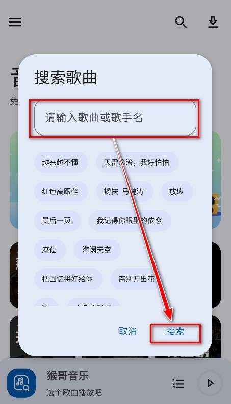 2、首先输入歌曲/歌手名称,然后单击搜索。