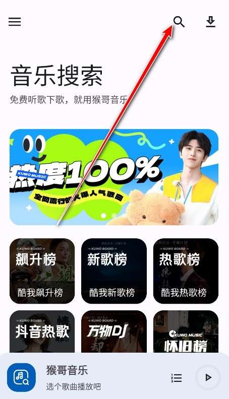 1、首先,您需要下载并安装猴哥音乐,进入软件,然后单击放大镜。
