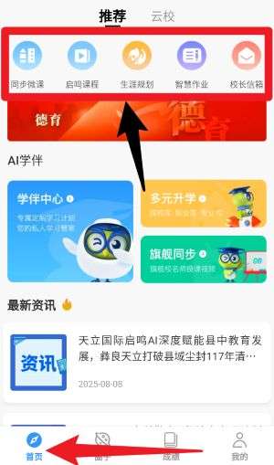 2、登录成功后默认进入首页,在首页可选择“同步微课、智慧作业、职业规划”等栏目,快速查看所需服务。