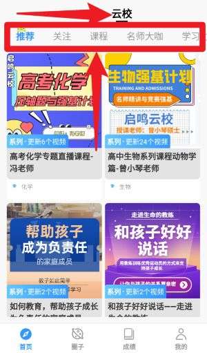 3、点击上方“云校”标签页切换内容板块,在此可查看推荐课程、老师大咖和学习内容。