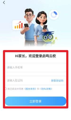 1、打开启鸣云校后,首先通过输入手机号与验证码完成登录操作,点击“立即登录”即可进入主界面。