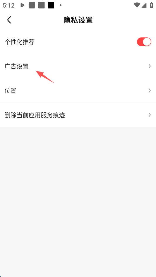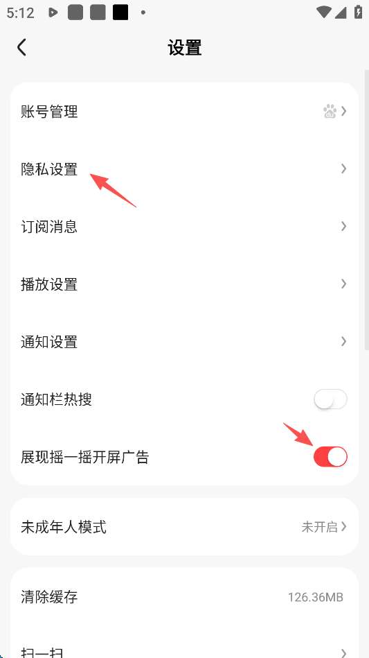 3、点击屏幕下方“展现摇一摇开屏广告”右侧的“开关键”,将其关闭,随后点击屏幕左上方的“隐私设置”。