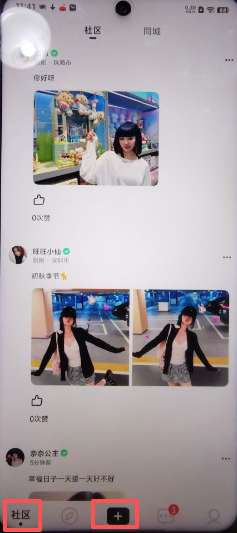 1、利用手机号登录进入“社区”页面,找到页面上的“+”。