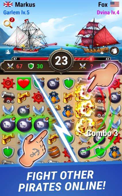海盗和谜题海盗船这里是一场海上的海盗之间的战争,而玩家们要做的就是选择一个自己可以拥有的渔船放置在海上进行航行,遇到对手就可以参与对战了,对唱的方式比较的特别就是以消除不同空气武器进行激发渔船的攻击技能。工具界面会分为上下两部分,上面则是渔船的对战景象,下面则是大家要操作的,消除板块了。