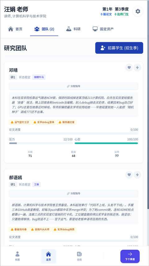 6、玩家还需在团队版块中进行招生,以此辅佐自己进行学术研究。