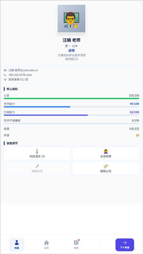 3、在档案页可查看个人信息,以及进行自我调节,如校园漫步、全身按摩、修改论文等;